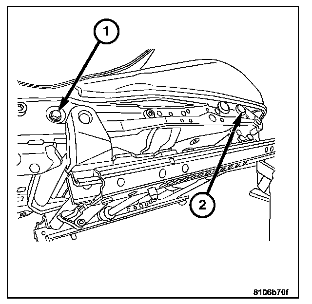 3. Install the power seat track front outboard attachment bolt (2).