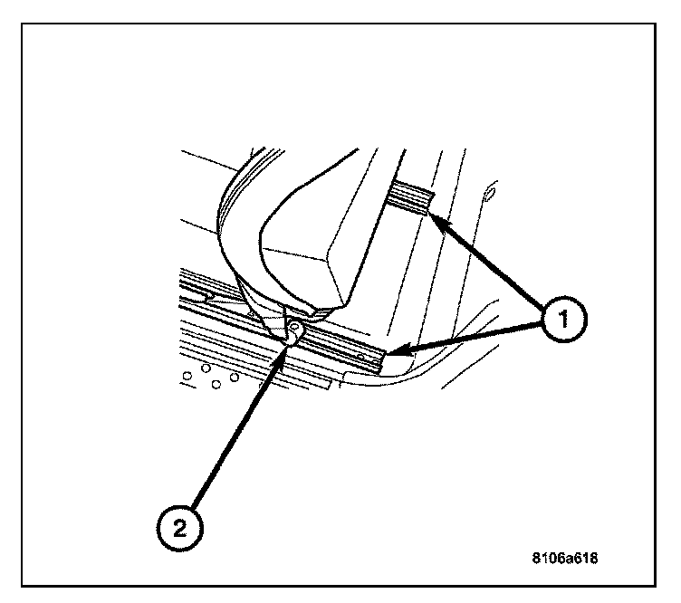 8. Install the two front seat track bolts (2). Tighten to 50 N.m (37 ft.lbs.).
