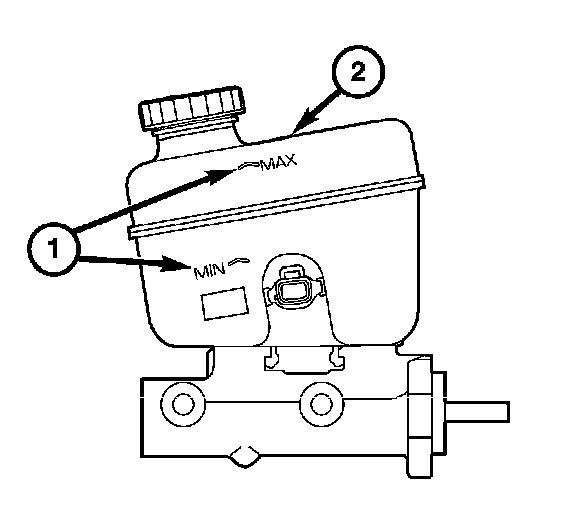 The master cylinder is used for all applications. The master cylinder has an aluminum body and a nylon reservoir with a single filler cap. A fluid level indicator (2) is molded into the top of the reservoir. The fill levels (1) are located on the side.
