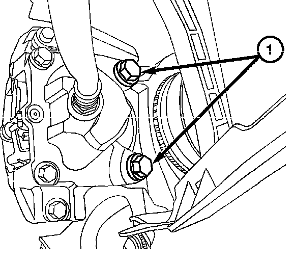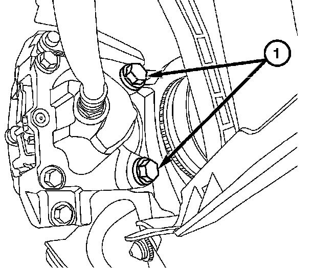 4. Remove the caliper mounting bolts (1) and remove the caliper from the knuckle.