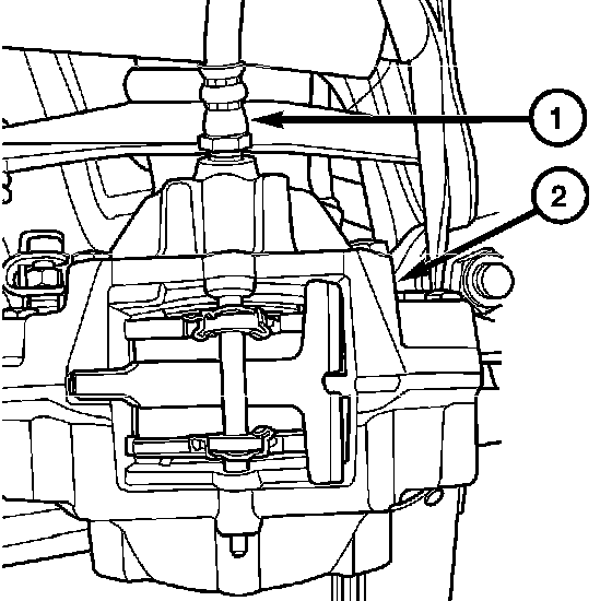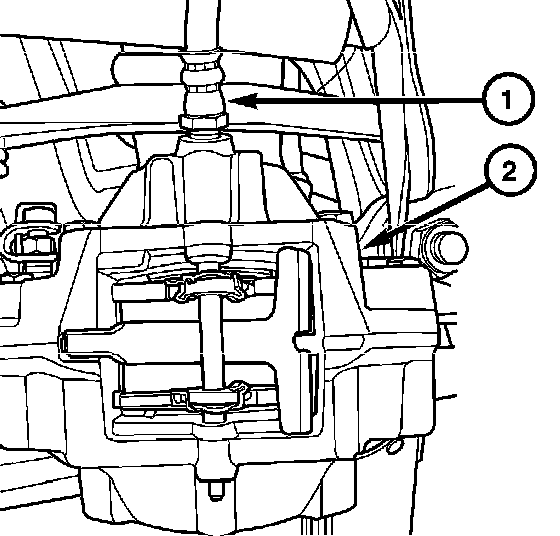 5. Remove the brake hose (1) from the caliper (2) by rotating the caliper while holding the brake hose with a line wrench.