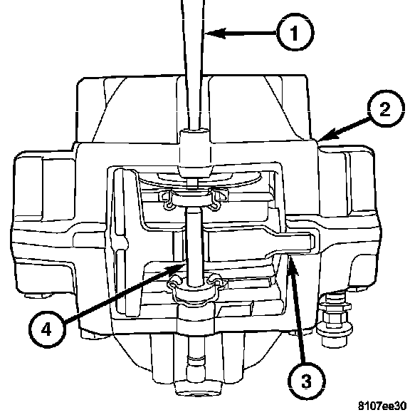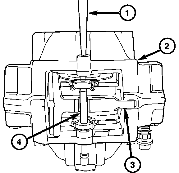 3. Install the retaining pin (4) through the hole in the side of the caliper (2). Tap the pin (4) into the caliper (2) until it is threaded through both brake pads and over the anti-rattle clip (3).