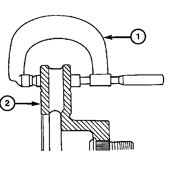 Measure rotor (2) thickness a minimum of six points around the rotor face with a micrometer (1). Position the micrometer approximately 3/4 inch (19 mm) from the rotor outer circumference for each measurement.