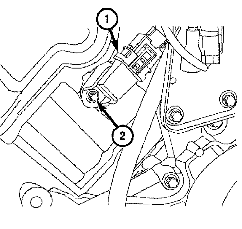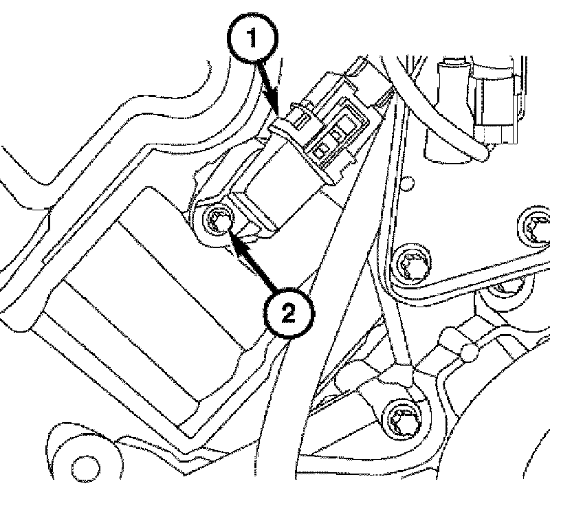 5. Disconnect the camshaft position sensor harness connector (1) and remove the bolt (2) and the sensor. (right side only).