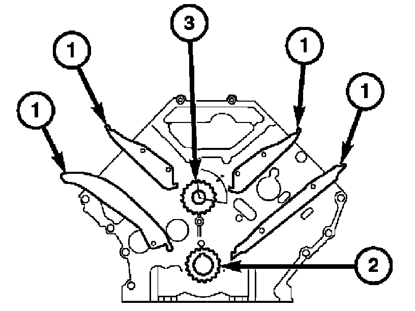 2. Remove the timing chain guides (1) off of the mounting pins. Inspect and replace worn or damaged guides as required.