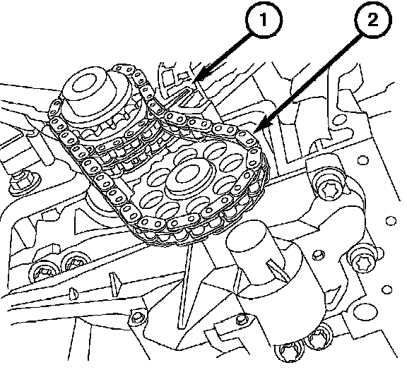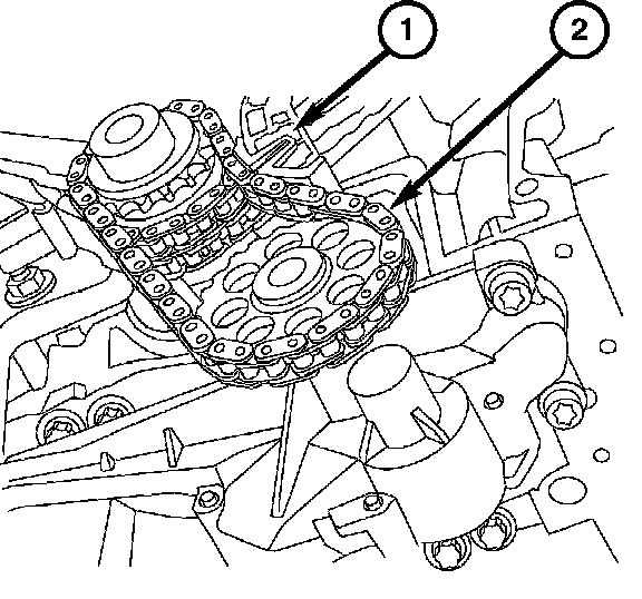 2. Remove the oil pump drive chain (2) and tensioner (1).