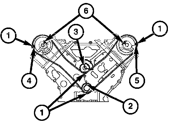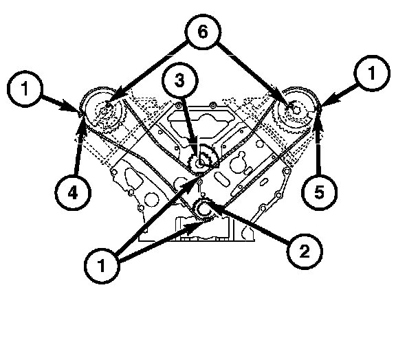 5. Insert the camshaft sprockets (6) into the timing chain and align the camshaft sprocket timing marks (4) and (5) with the copper teeth (1) of the timing chain.