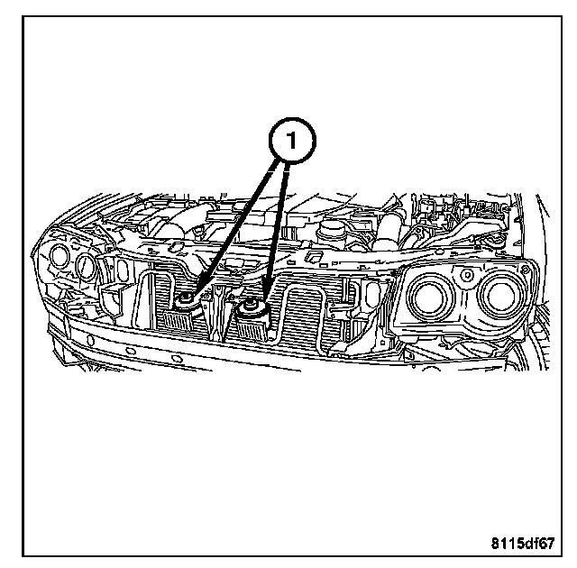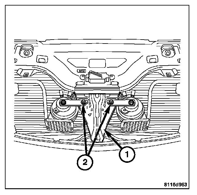 4. Remove the horn bracket mounting bolt (2) from the core support brace (1), and remove the horn.