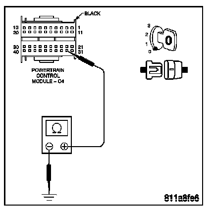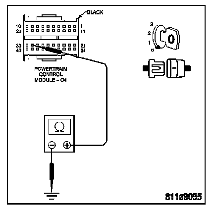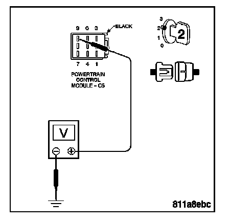 Measure the voltage of the Fused Ignition Switch Output circuit at the PCM C5 harness connector.