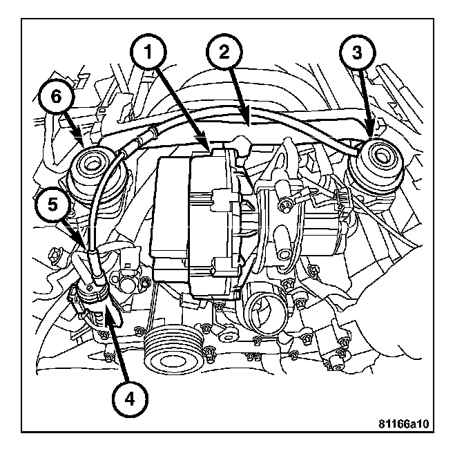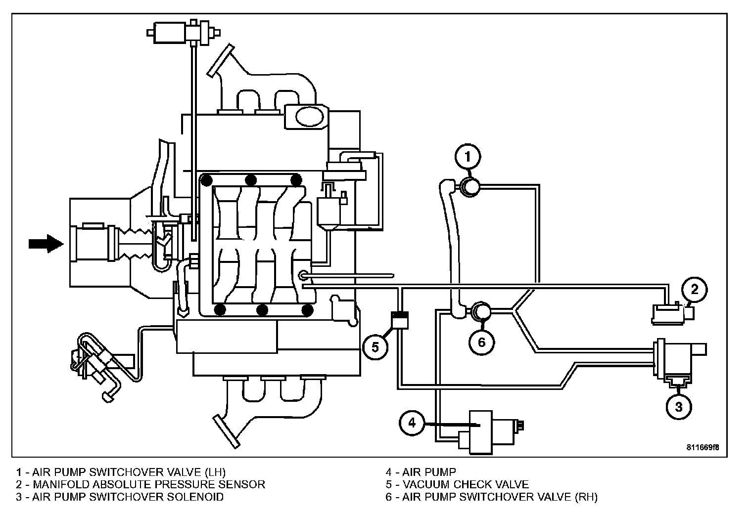 This vehicle is equipped with an air pump that injects air into the exhaust to reduce the emissions during engine warmup. The air injected into the exhaust will cause the catalytic converters to heat up more quickly. This will improve the emission levels during a cold start. The air pump switchover system incorporates an air pump (4) with two air pump switchover valves (1 and 6), an air pump switchover solenoid (3), an air pump relay, a vacuum check valve (5) and the PCM.