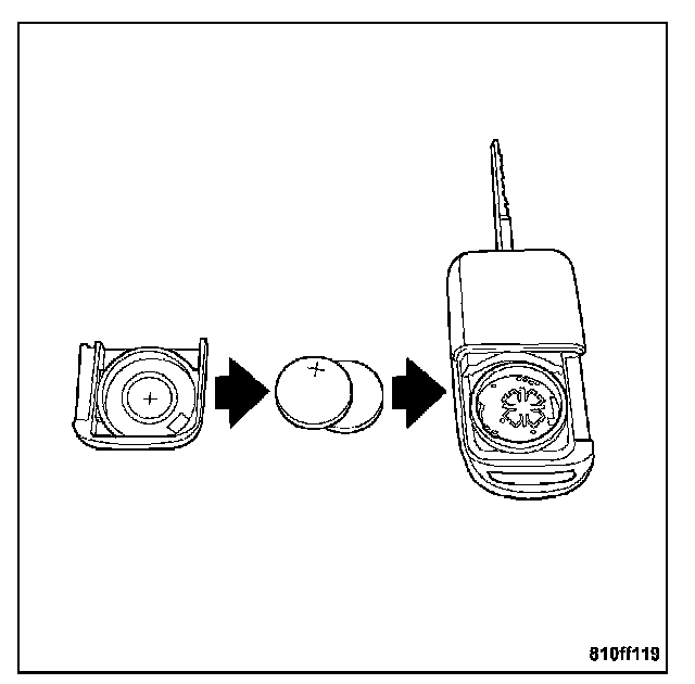 The transmitter has two 3 volt batteries, which can be removed and replaced without special tools. First, release the key from the closed position; then insert a coin in the side slot of the transmitter and twist. The cover should separate from the body of the transmitter where the batteries are stacked on top of each other. The batteries are available at local retail stores. Recommended replacement batteries are Panasonic(R) CR 2025 lithium or equivalent. Battery life for normal use is about two years.