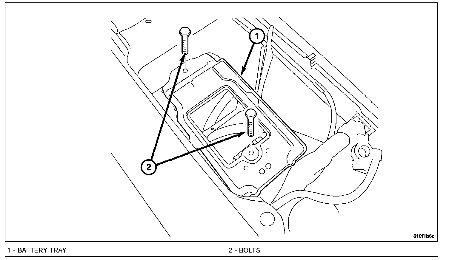 2. Remove the battery tray (1) retaining bolts (2).