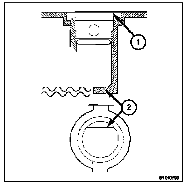 2. Look through the battery cap holes (1) to determine the level of the electrolyte in the battery. The electrolyte should be approximately 1 centimeter above the battery plates or until the lip (2) inside the battery cap holes is covered.