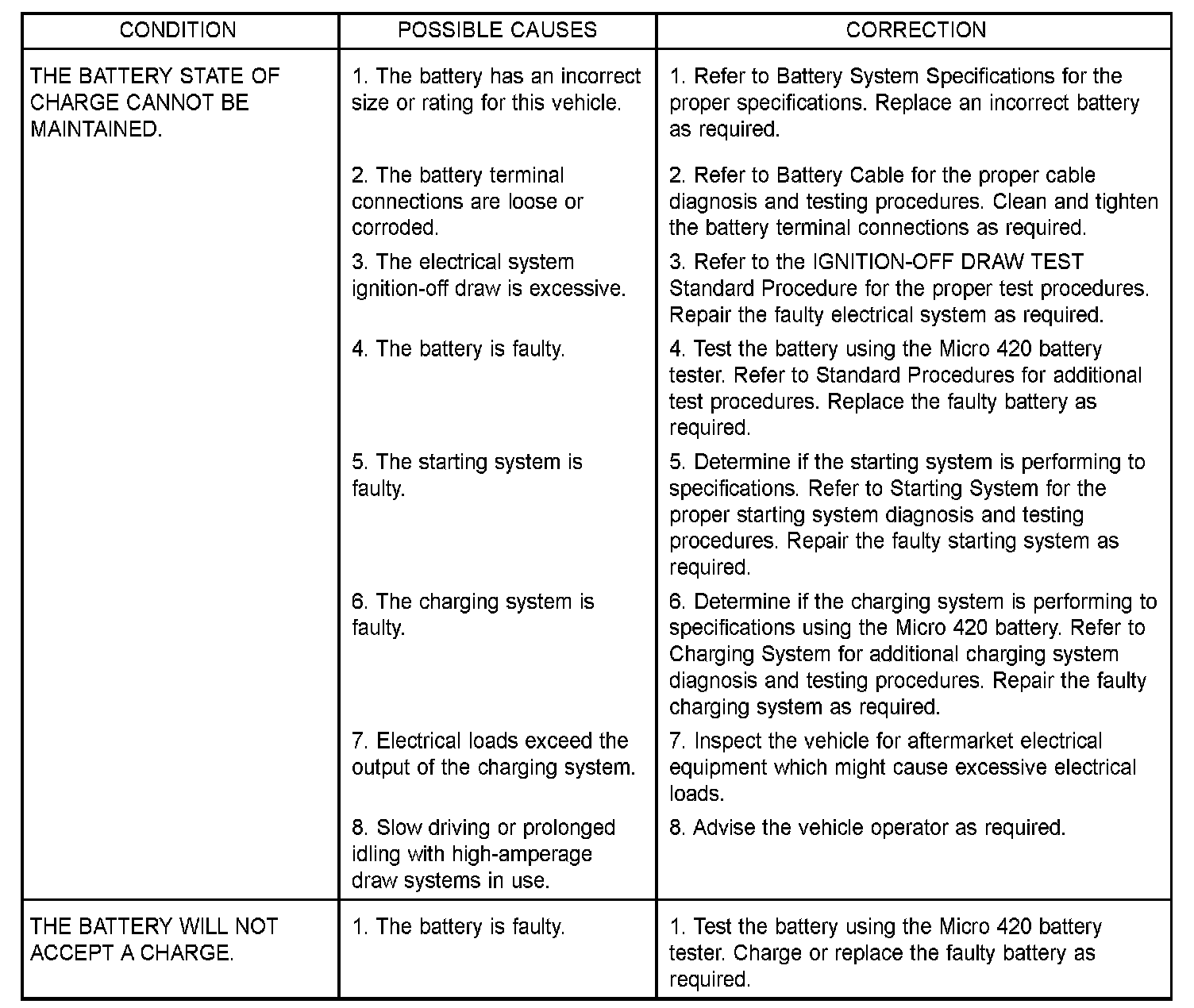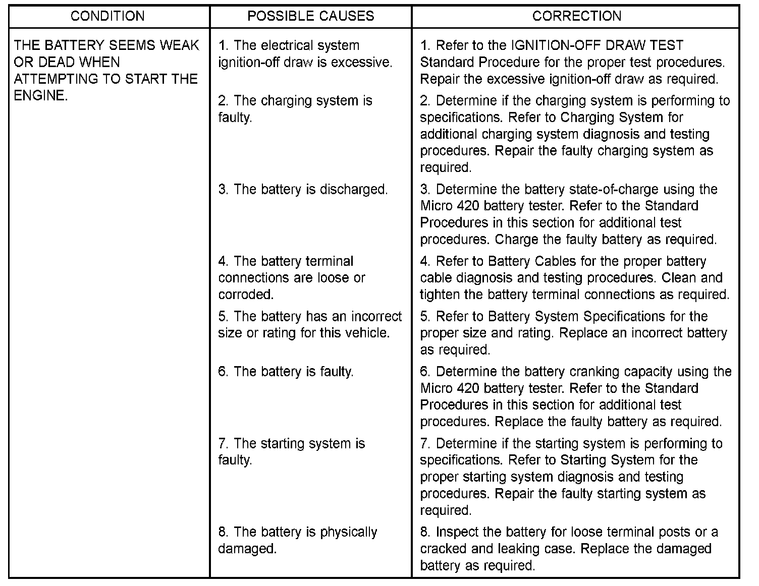 The battery, starting, and charging systems in the vehicle operate with one another and must be tested as a complete system. In order for the engine to start and the battery to maintain its charge properly, all of the components that are used in these systems must perform within specifications. It is important that the battery, starting, and charging systems be thoroughly tested and inspected any time a battery needs to be charged or replaced. The cause of abnormal battery discharge, overcharging or early battery failure must be diagnosed and corrected before a battery is replaced and before a vehicle is returned to service. The service information for these systems has been separated to make it easier to locate the specific information you are seeking. However, when attempting to diagnose any of these systems, it is important that you keep their interdependency in mind.