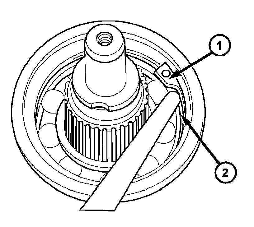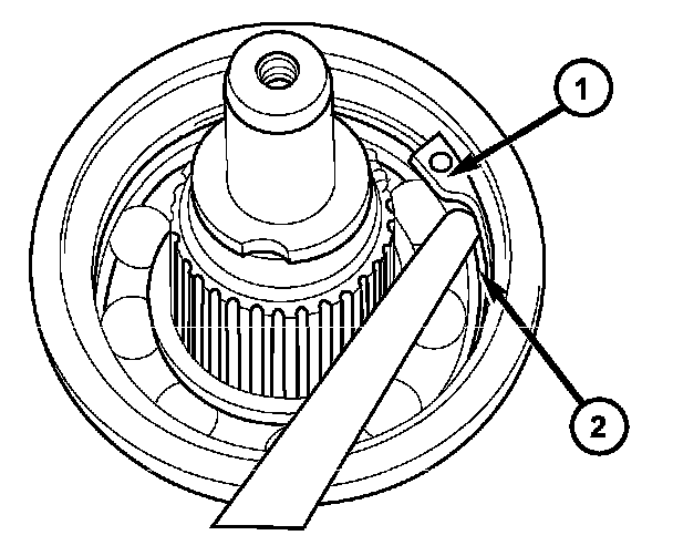 8. Remove the transmission rear output shaft bearing retaining ring (1).