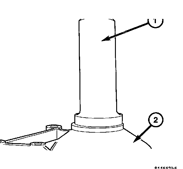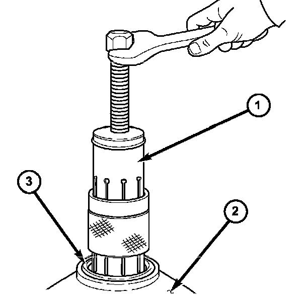 c. Press downward on Special Tool 9078 (1) until the staking pin (3) contacts the output shaft nut flange (2).