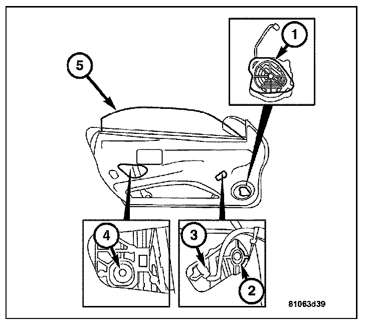 8. Lower the window until the mounting screws (2-4) are accessible through the assembly openings in the door.