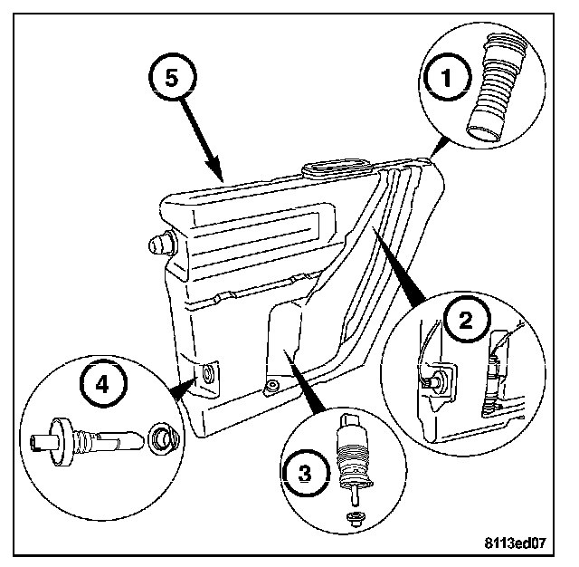 5. Gently pull the washer reservoir (5) forward to release the rubber mounting grommets.
