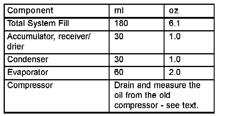 When an air conditioning system is first assembled at the factory, all components (except the A/C compressor) are refrigerant oil free. After the refrigerant system has been charged with (R-134a) refrigerant and operated, the oil in the A/C compressor is dispersed through the lines and components. The A/C evaporator, A/C condenser and the accumulator or receiver/drier (depending on application) will retain a significant amount of oil. Refer to the A/C Component Refrigerant Oil Capacities table. When a component is replaced, the specified amount of refrigerant oil must be added. When a new A/C compressor is being installed, drain the lubricant from the used compressor, measure the amount drained and discard the used lubricant. Drain the lubricant from the new A/C compressor into a clean container. Return the amount of lubricant measured from the used compressor, plus the amount reclaimed from the system back into the new A/C compressor. When a line or component has ruptured and oil has escaped, the accumulator or receiver/drier (depending on application) must be replaced along with the ruptured component.