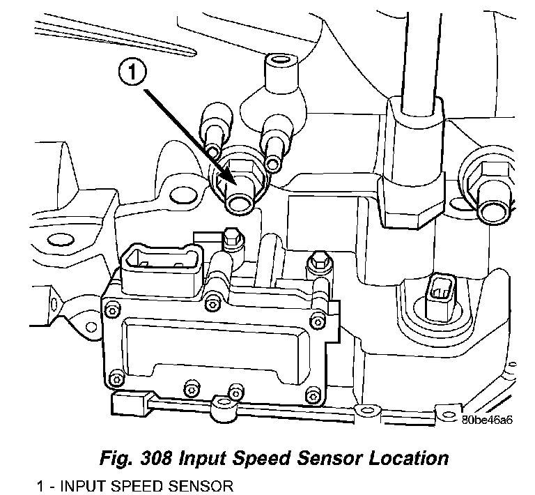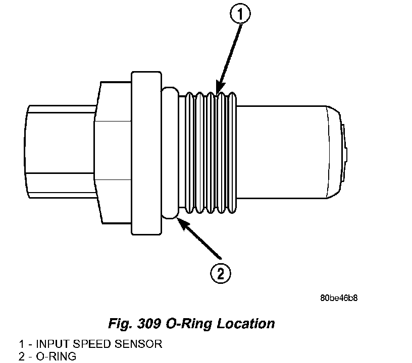 The Input Speed Sensor is a two-wire magnetic pickup device that generates AC signals as rotation occurs. It is threaded into the transaxle case (Fig. 308), sealed with an O-ring (Fig. 309), and is considered a primary input to the Powertrain/Transmission Control Module.