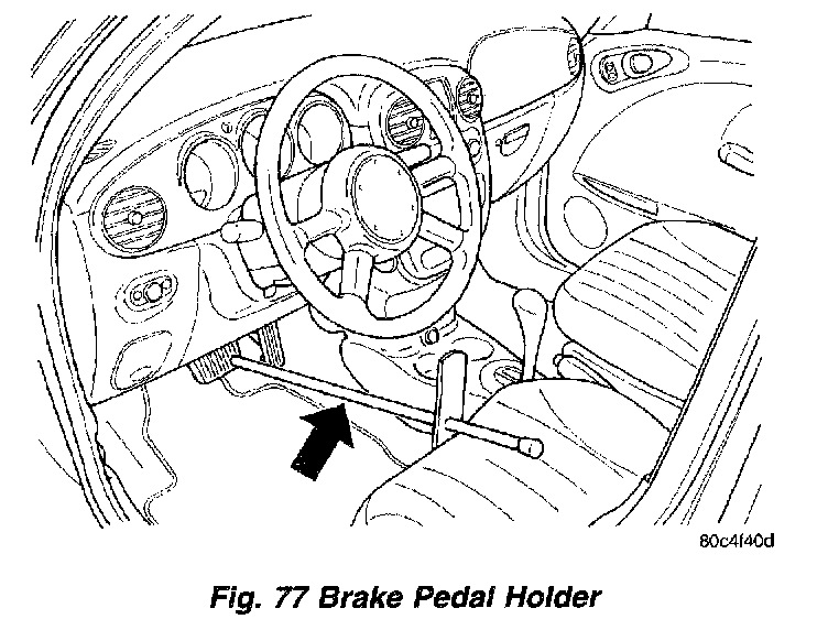 1. Using a brake pedal holding tool as shown, depress the brake pedal past its first one inch of travel and hold it in this position. This will isolate the master cylinder from the brake hydraulic system and will not allow the brake fluid to drain out of the master cylinder reservoir.