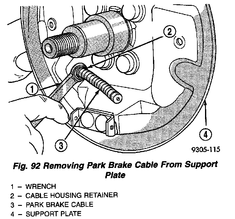 10. Position a 1/2 inch wrench over the retainer fingers on the end of the parking brake cable. Compress the cable housing retaining fingers with the wrench, then pull the cable housing out of the support plate. Remove the wrench as the parking brake cable retainer is freed from the mounting hole in the brake support plate.