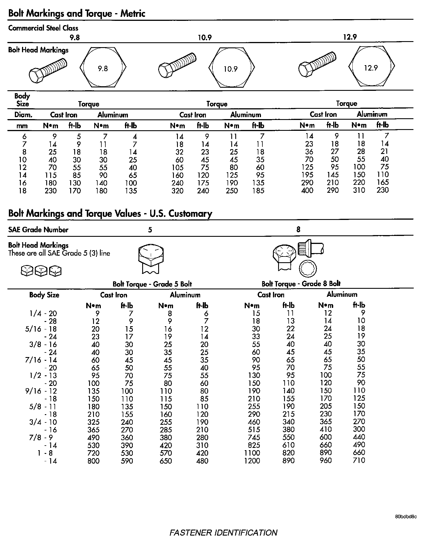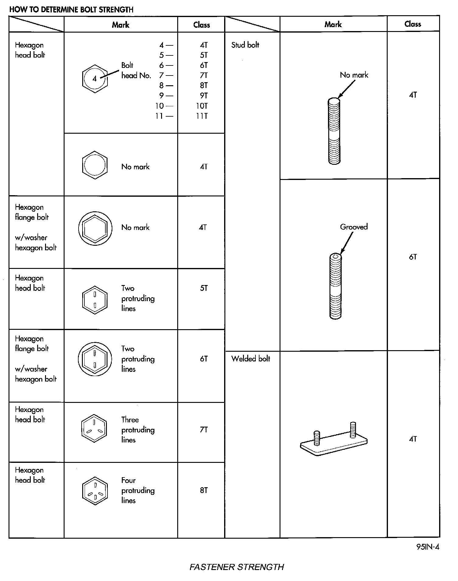 The SAE bolt strength grades range from grade 2 to grade 8. The higher the grade number, the greater the bolt strength. Identification is determined by the line marks on the top of each bolt head. The actual bolt strength grade corresponds to the number of line marks plus 2. The most commonly used metric bolt strength classes are 9.8 and 10.9. The metric strength class identification number is imprinted on the head of the bolt. The higher the class number, the greater the bolt strength. Some metric nuts are imprinted with a single-digit strength class on the nut face. Refer to the Fastener Identification and Fastener Strength Charts.
