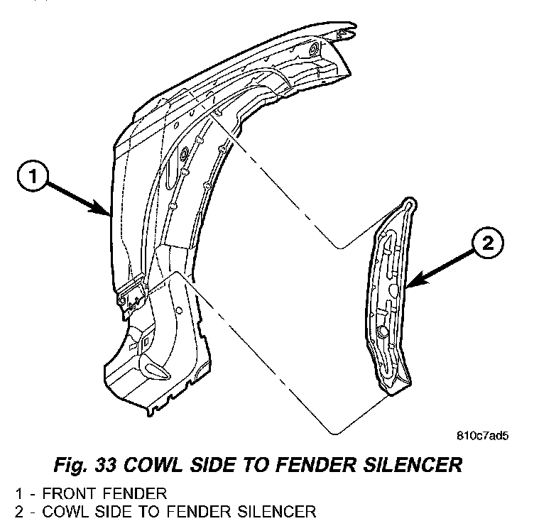1. Insert silencer between cowl side and fender, forward of wiring, connector and brackets (Fig. 33).