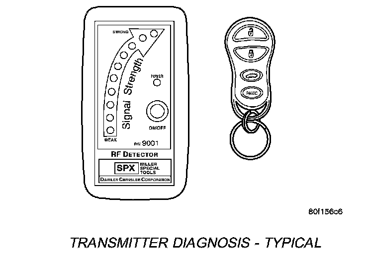Using special tool 9001, first test to ensure that the transmitter is functioning. Typical testing distance is 2.5 centimeters (1 inch) for Asian transmitters and 30.5 centimeters (12 inches) for all others. To test, position the transmitter as shown. Press any transmitter button, then test each button individually. The tool will beep if a radio signal strength that lights five or more LED's is detected. Repeat this test three times. If transmitter fails any of the test, refer to the Diagnostic Procedures manual.