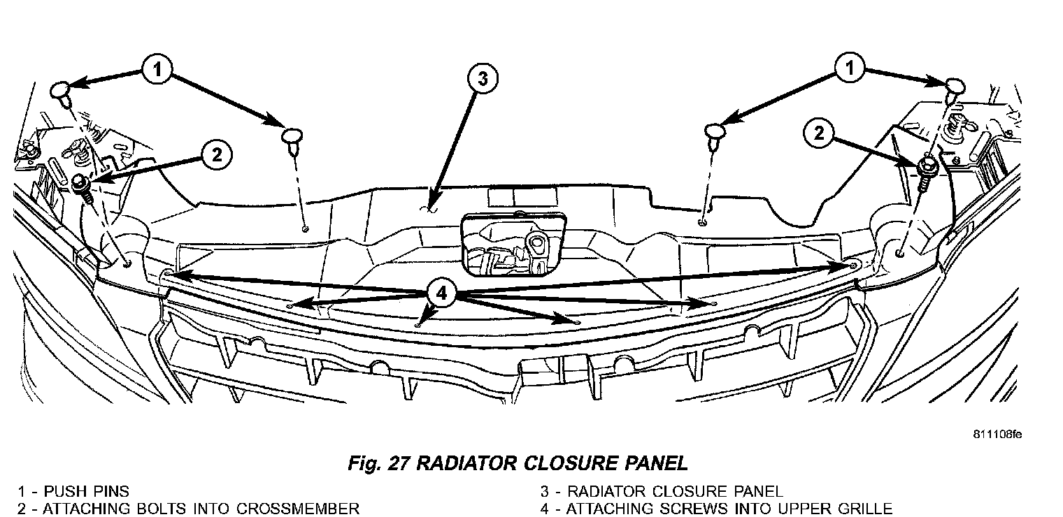 2. Remove four push pins attaching radiator closure panel to radiator crossmember.