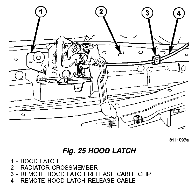 4. Remove screws attaching hood latch to radiator crossmember (Fig. 25).