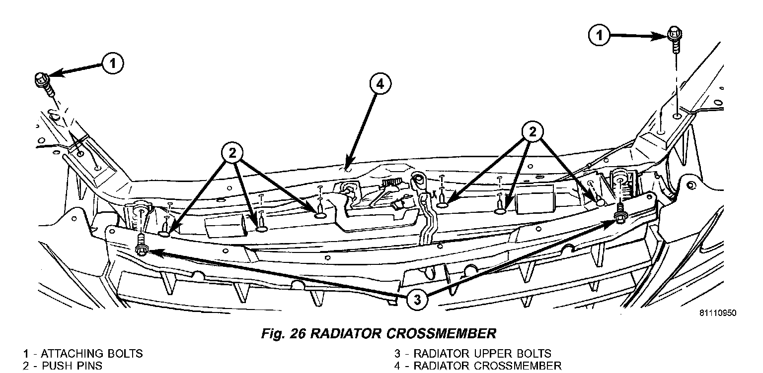 6. Remove radiator two top attaching bolts to radiator crossmember (Fig. 26).