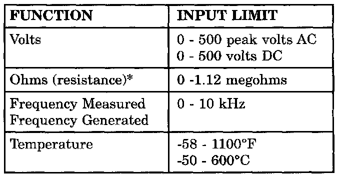 * Ohms cannot be measured if voltage is present. Ohms can be measured only in a non-powered circuit.