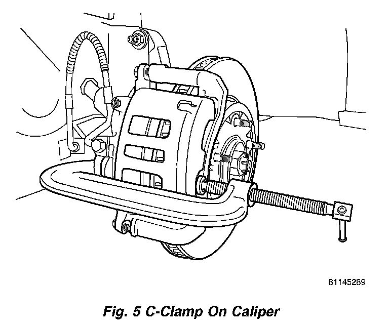 4. Place an appropriately sized C-Clamp over brake caliper as shown (Fig. 5), placing screw-drive head against outboard shoe and hook against rear of caliper. Slowly tighten screw-drive retracting caliper pistons into bores and breaking outboard brake shoe free from caliper fingers. Do not overtighten C-Clamp. Remove C-Clamp.