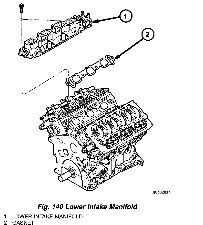 13. Remove bolts attaching lower intake and remove intake manifold (Fig. 140).