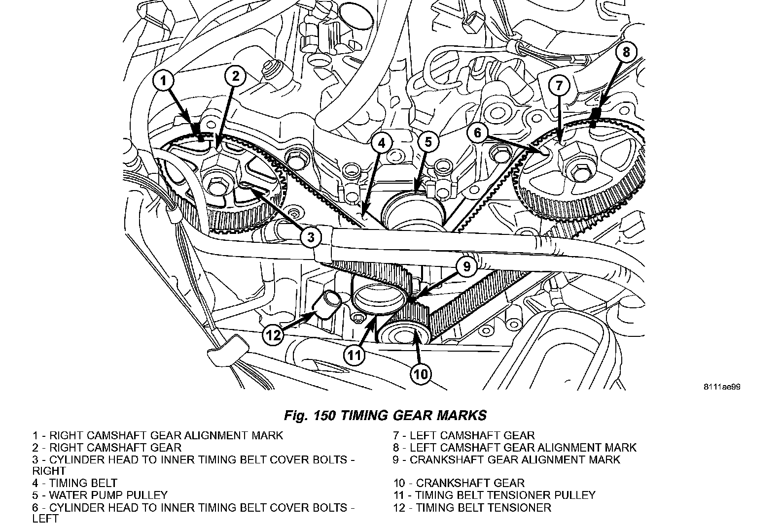 4. Install the belt around the last sprocket. Maintain tension on the belt as it is positioned around the tensioner pulley. Each camshaft sprockets mark should still be aligned with the rear cover marks (Fig. 150).
