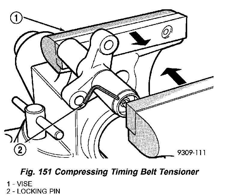 7. Remove the timing belt tensioner (Fig. 150) and remove timing belt.