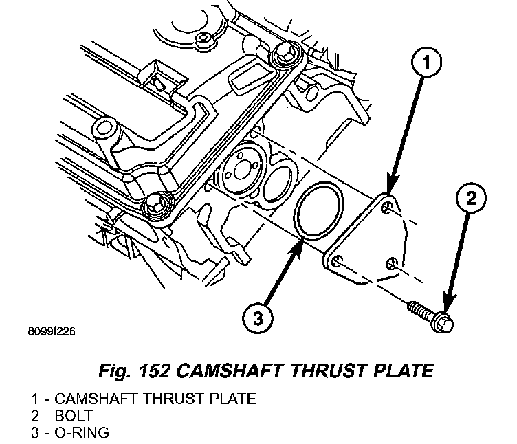 5. Remove camshaft retainer/thrust plate from rear of right cylinder head (Fig. 152).