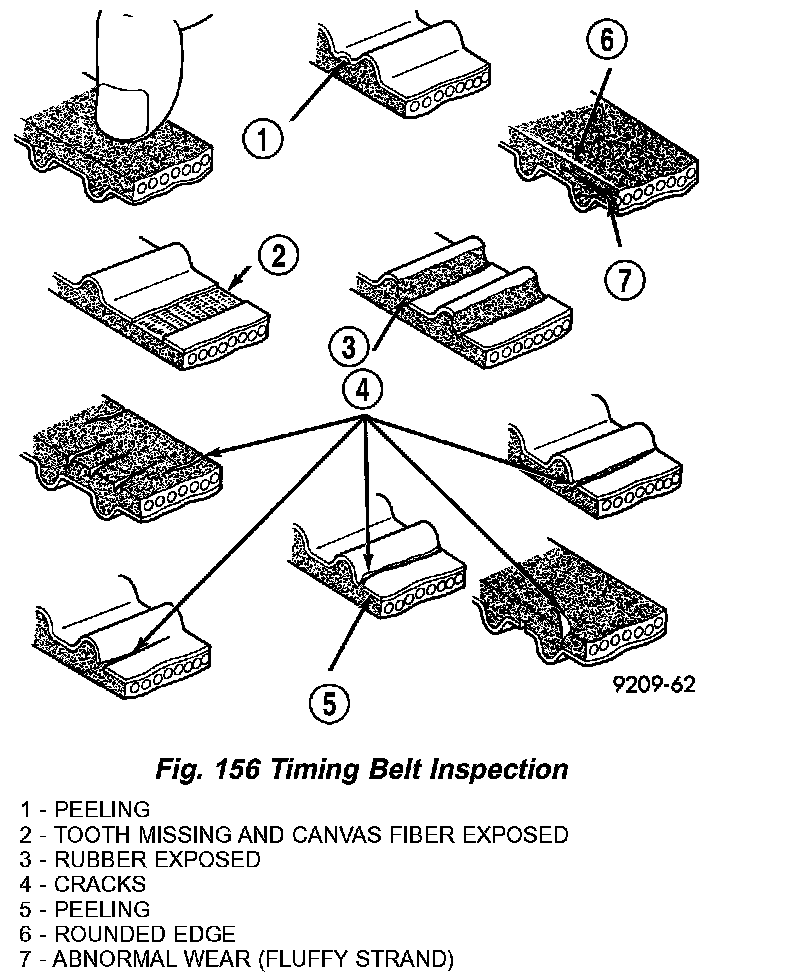 2. Inspect both sides of the timing belt. Replace belt if any of the following conditions exist (Fig. 156):