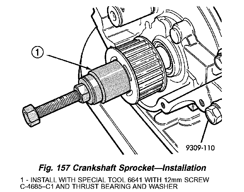 1. Install crankshaft sprocket using Special Tools 6641 and C-4685-C1 (Fig. 157).