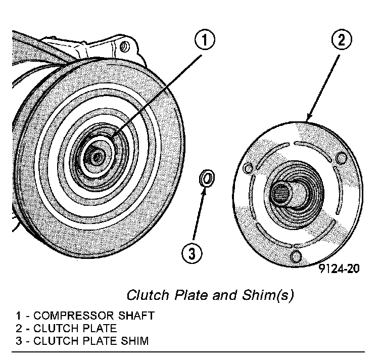 6. If the original clutch plate and clutch pulley are to be reused, reinstall the original shim(s) on the compressor shaft against the shoulder. If a new clutch plate and/or clutch pulley are being used,