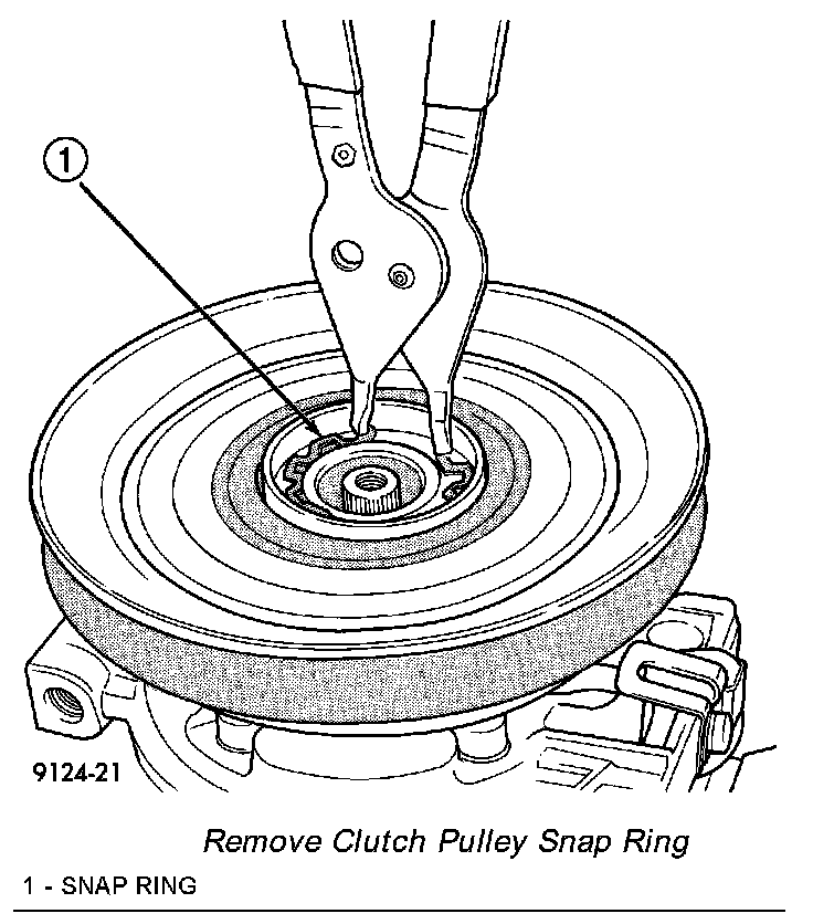 NOTE: A new snap ring must be used to secure the clutch pulley to the compressor. The bevel side of the snap ring must face outward.