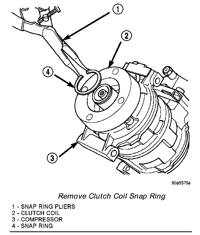 NOTE: A new snap ring must be used to secure the clutch coil to the compressor. The bevel side of the snap ring must face outward.