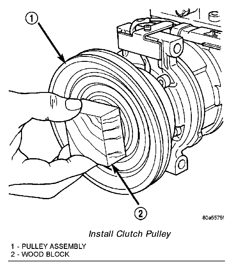 4. Install the pulley onto the front cover of the compressor. If necessary, tap the pulley gently with a block of wood placed on the pulley friction surface .