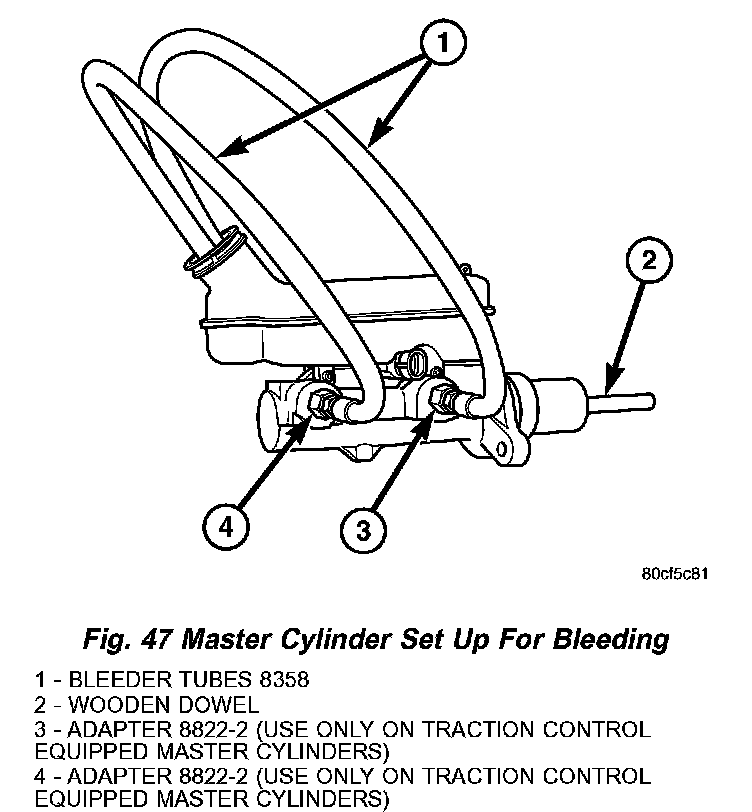 NOTE: Use correct bleeder tubes when bleeding master cylinder. Master cylinder outlet ports vary in size and type depending on whether master cylinder is for a vehicle equipped with traction control or not. Traction control equipped master cylinders require the additional use of ISO style flare adapters supplied in Special Tool Package 8822 to be used in conjunction with Bleeder Tubes, Special Tool Package 8358.