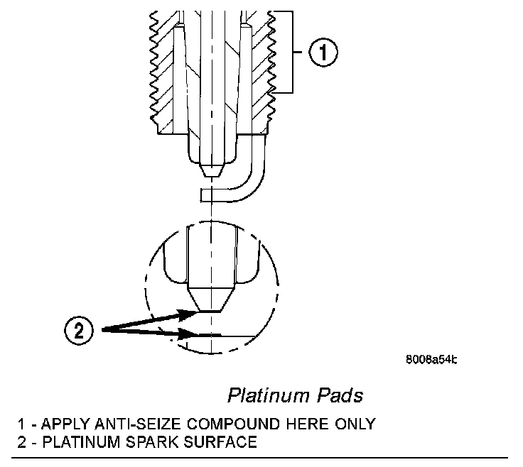 When the spark plugs use a single or double platinum tips and they have a recommended service life of 100,000 miles for normal driving conditions per schedule A in this manual. The spark plugs have a recommended service life of 75,000 miles for severe driving conditions per schedule B in this manual. A thin platinum pad is welded to both or just the center electrode end(s) as shown . Extreme care must be used to prevent spark plug cross threading, mis-gapping and ceramic insulator damage during plug removal and installation.