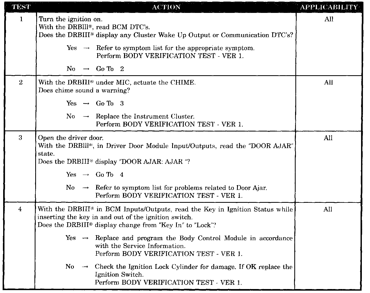 KEY IN IGNITION AND DRIVER'S DOOR OPEN CHIME NOT OPERATING PROPERLY