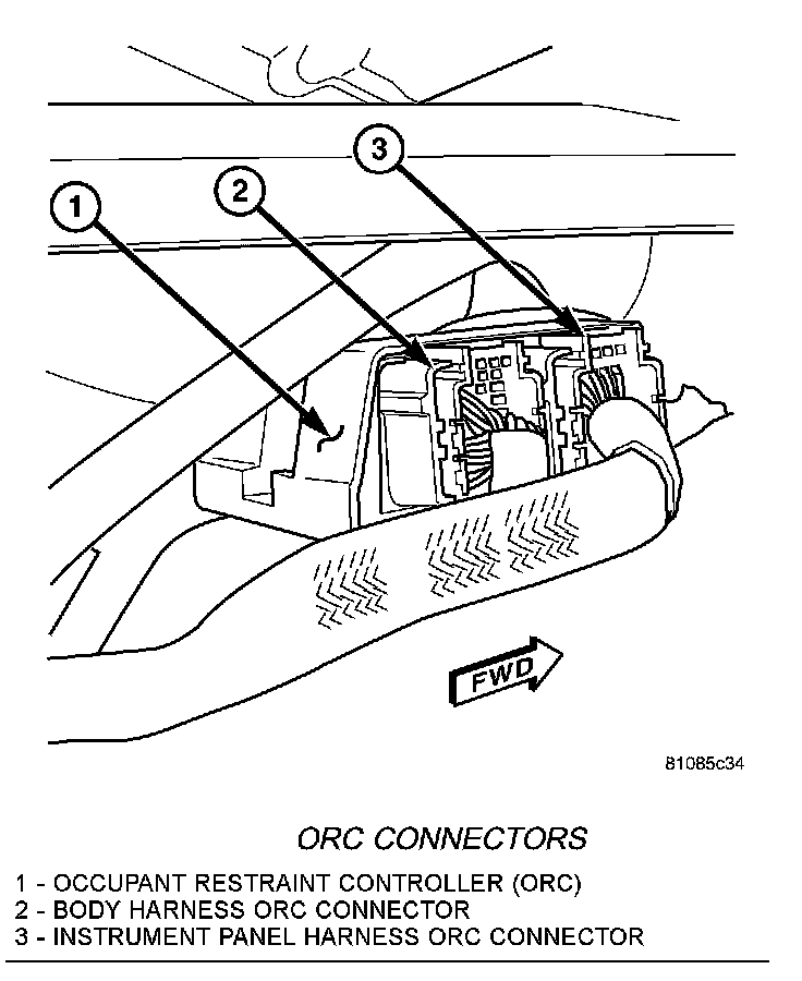 4. From the right side of the vehicle, disconnect the two ORC electrical connectors.