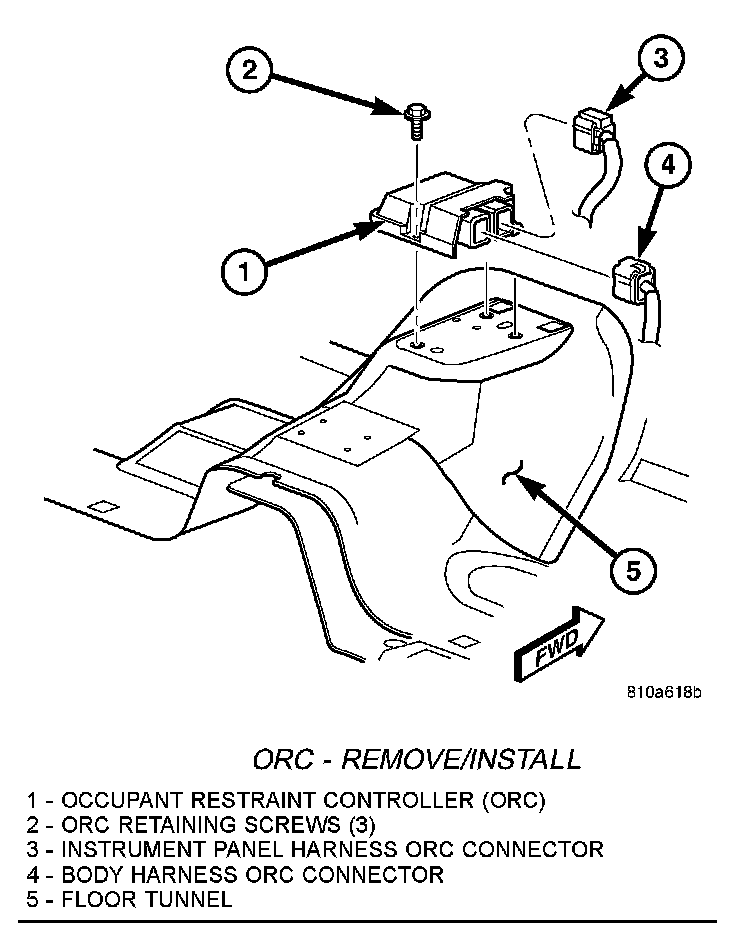 5. Remove the three retaining screws to the ORC. One on the left side of the floor tunnel, and one in front of (toward bulkhead) and behind (toward vehicle rear) the ORC unit.
