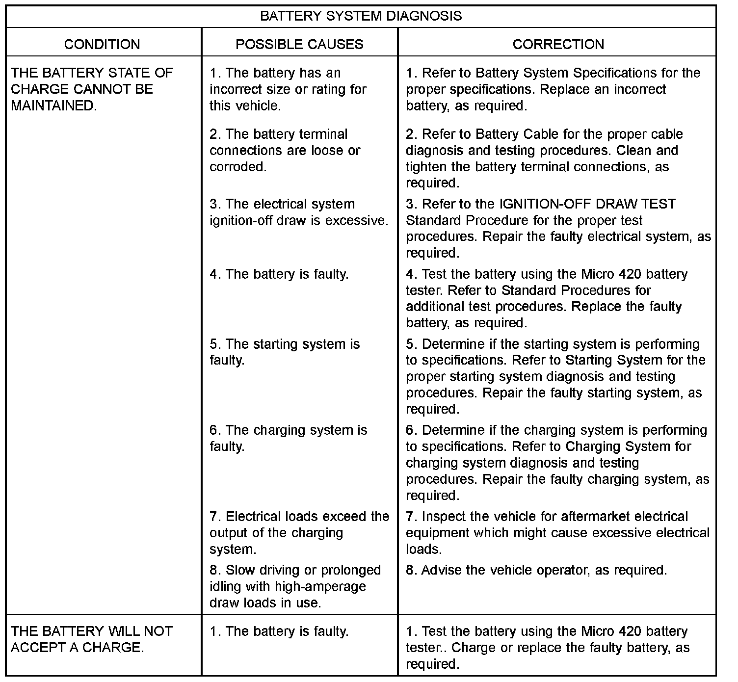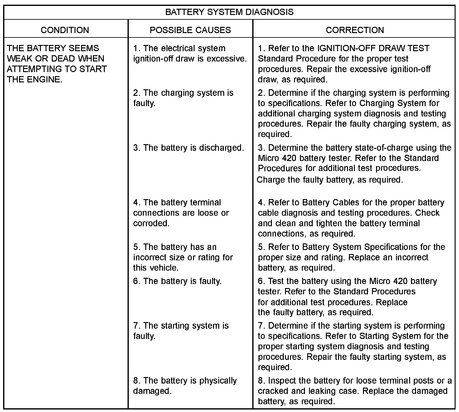 2. A faulty or incorrect battery Use Micro 420 tester and refer to Standard Procedures for additional battery diagnosis and testing procedures.